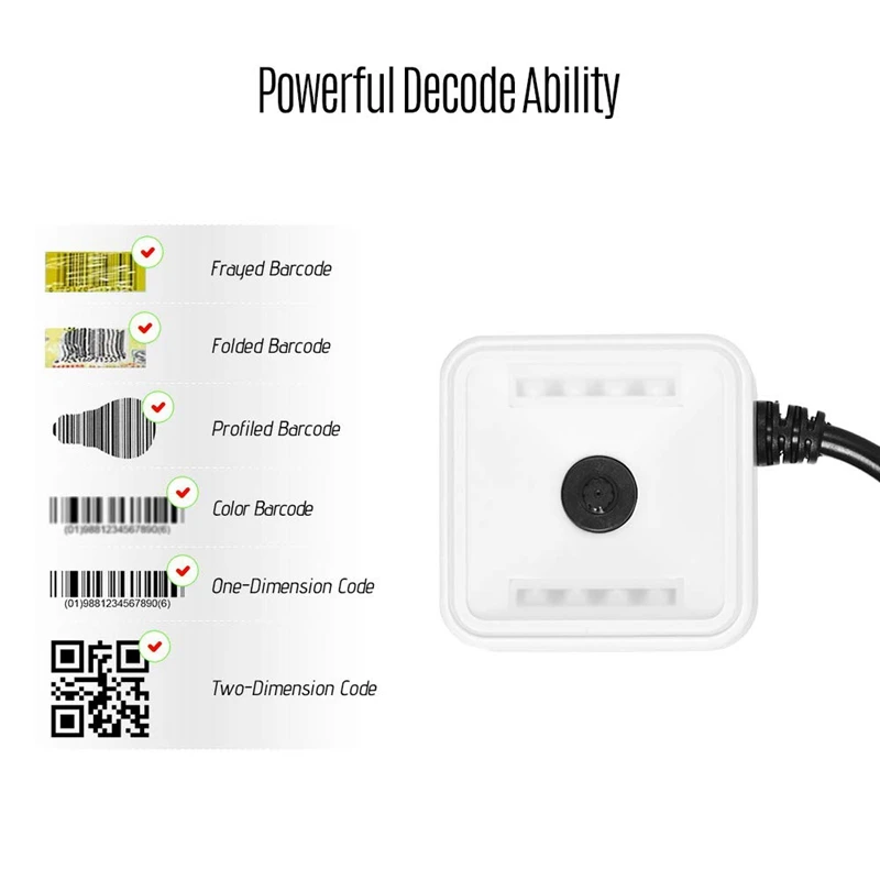 Adopting high sensitivity CMOS sensor, the scanner has strong decoding ability to effectively identify fuzzy, color or anomalous barcodes; paper or film 1D 2D barcodes; high reflective screen or low brightness screen barcodes and so on.