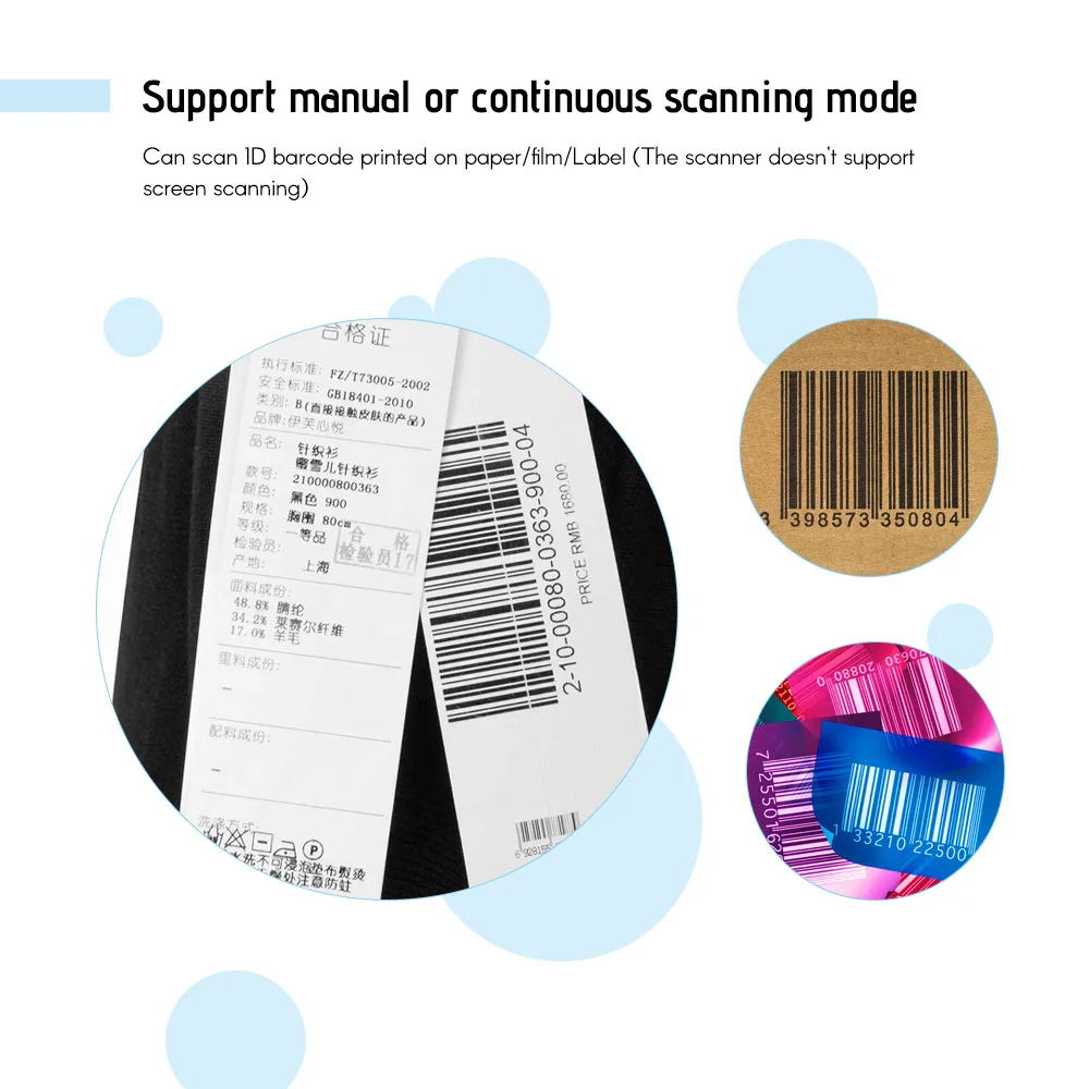 Support manual or continuous scanning mode,can scan 1D barcode printed on paper/film.