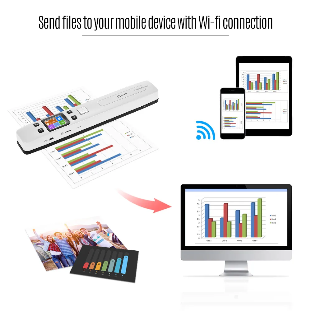 Wifi 1050DPI High Speed Portable Wand Document Images Scanner A4 Size JPG/PDF Formate LCD Display for Business Reciepts Books