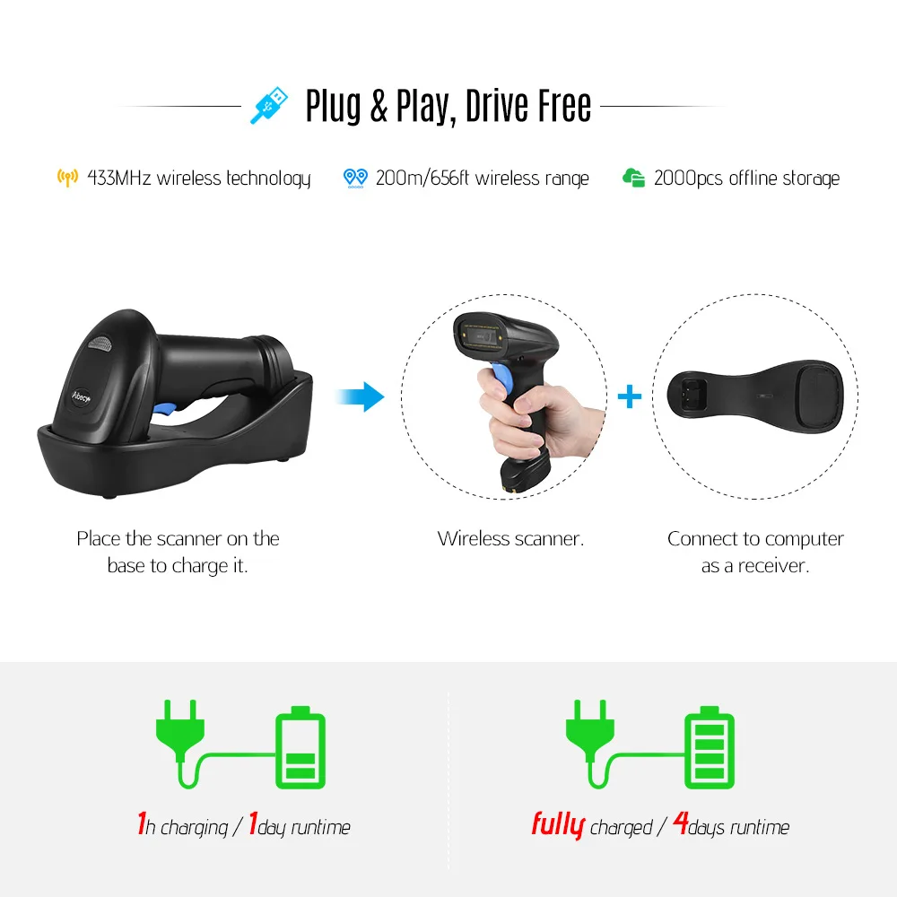 The scanner cradle also works as charger and wireless receiver, and the scanner itself do not need to connect any cable.