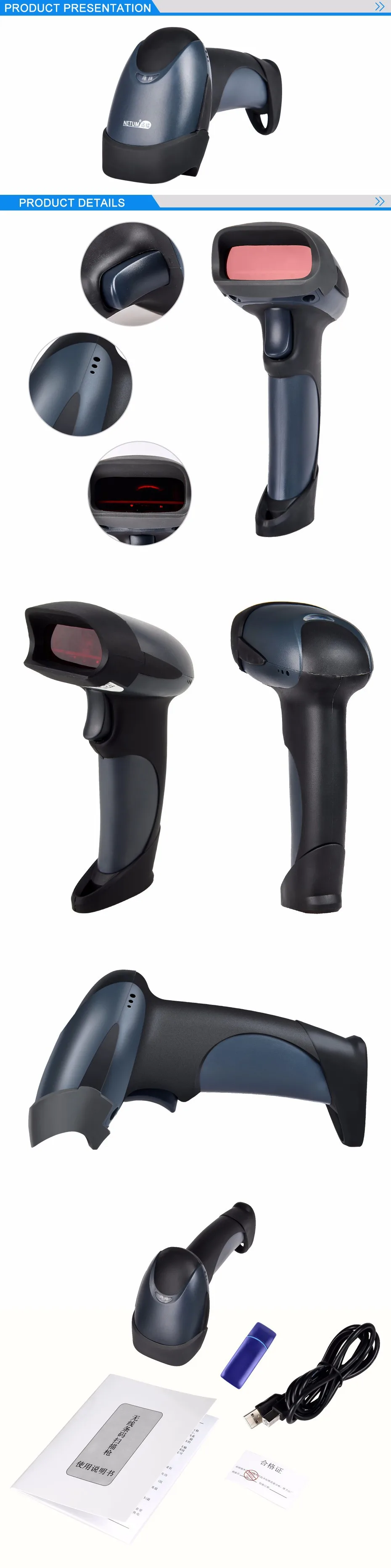 NT-M2 Product description: 433MHz 32bit Wireless cordless USB barcode scanner: Optical laser; Plug & Play; Handheld Easy to set up: Need no driver; ABS+PC material: Durable & Pratical 256KB Flash Memory 3000-5000 Bar Codes, Can support 254 barcode guns be used simultaneously in the same range Long range: 300 meter without any obstacle; Scanning speed: 180 times per second Support Win7, Win8, Win10, Mac OS X 10.8.4 or above