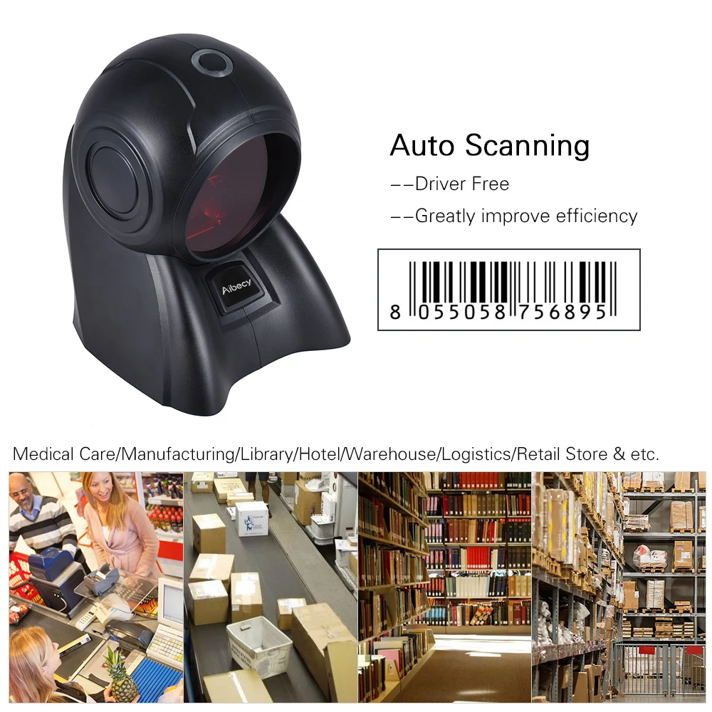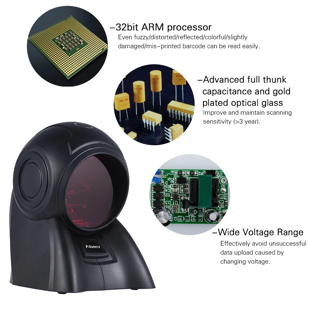 Aibecy 8160 barcode scanner can scan 1D barcode printed on paper/film. 5 directions, 4 lines each, total 20 lines make up an intensive and all-rounded scanning range! The scanning speed can reach 1800 times/second! 32bit ARM processor, full thunk capacitance and gold plated optical glass, ensuring high scanning capacity and long lasting high sensitivity!